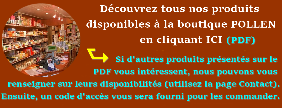 Si d'autres produits indisponibles sur ce site, mais présents en boutique (PDF), vous intéressent, nous pouvons vous renseigner sur leurs disponibilités (utilisez la page Contact). Nous vous communiquerons le mot de passe pour accéder à la page "Autres produits".